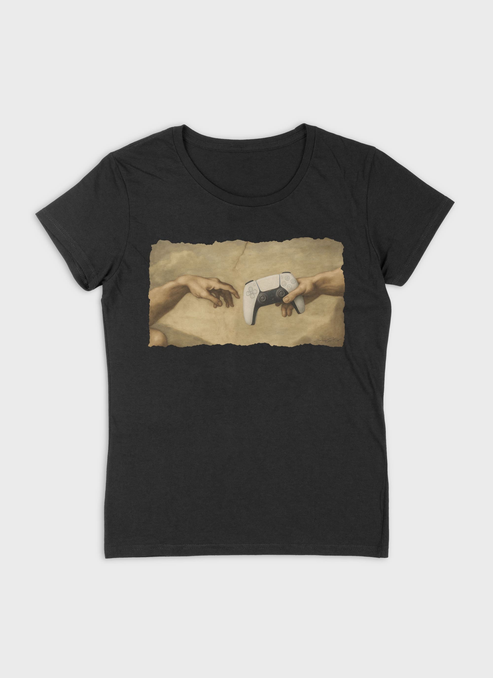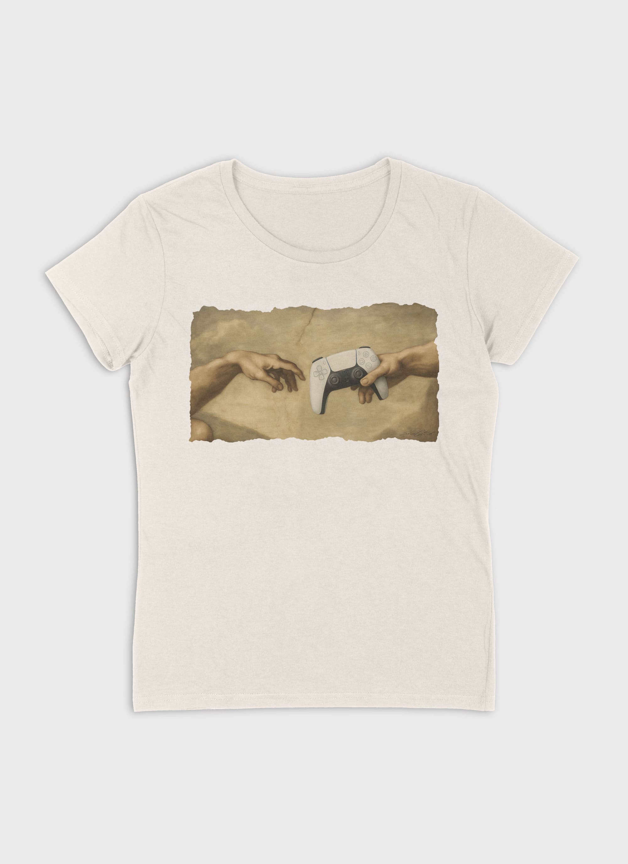 Dieses exklusive Damen T-Shirt aus 100 % Bio-Baumwolle bringt das Meisterwerk der Renaissance direkt in deinen Gaming-Style. Inspiriert von Michelangelos „Creation of Adam“, zeigt das Design zwei Hände, die sich fast berühren – doch statt göttlicher Funken wird ein moderner PlayStation 5 Dual Sense Controller überreicht. Ein starkes Statement für alle, die Gaming als wahre Kunst sehen und leben.